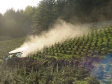Airblast sprayers use a combination of air propelled by a high speed fan and liquid to deliver the pesticide to trees. Nozzles operate under low pressure which deliver the spray droplets directly into the high-speed airstream. The blast of air shatters the drops into finer droplets and blows them into the field. In Christmas trees, typically airblast sprayers direct spray only to one side as the sprayer moves forward, and are mounted to a tractor and powered through the PTO. Tank capacity may be 100 to 400 gallons. An airblast sprayer may cover a swath of up to 100 feet.